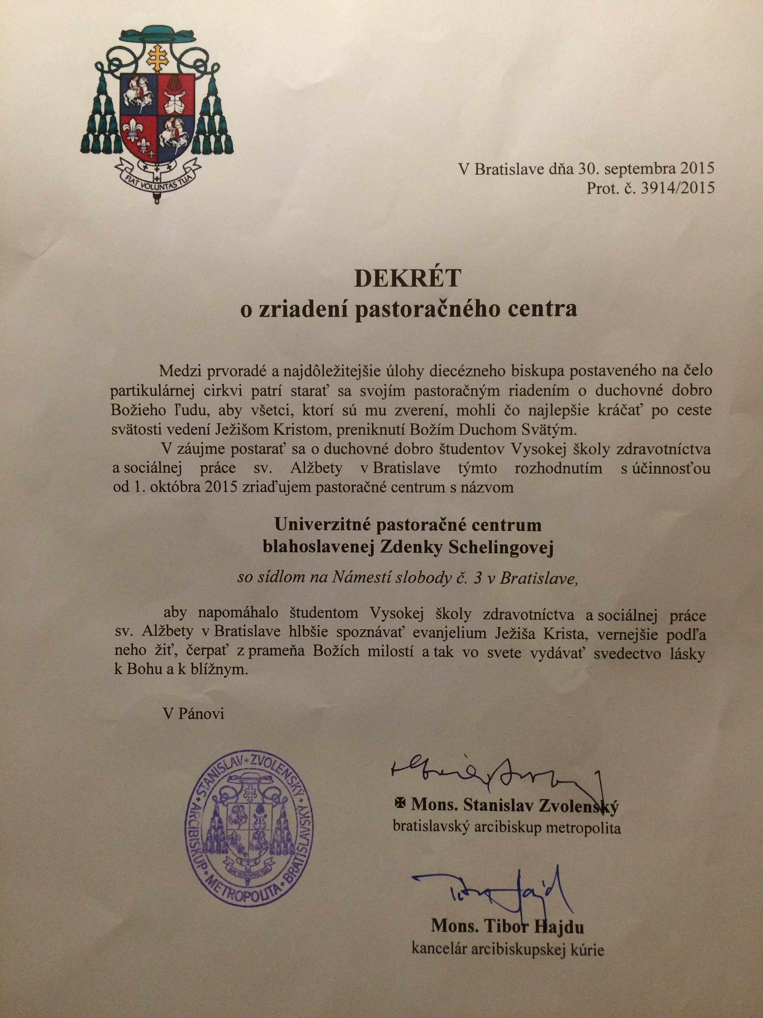 S radosťou si Vám dovolujeme oznámiť, že od 4.10.2016 máme v "srdci" našej VŠZaSP sv. Alžbety na Nám. 1. Mája 1 - na rektoráte, oficiálne zriadenú kaplnku sv. Alžbety Uhorskej. |